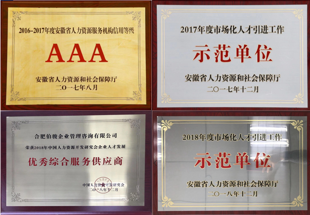 合肥伯駿企業(yè)管理咨詢有限公司前身為合肥企業(yè)經(jīng)營(yíng)者人才公司,成立于 1999 年 3 月,專注于為黨政機(jī)關(guān)與企事業(yè)單位提供中高級(jí)人才的培育、選拔、評(píng)價(jià)、獵頭及管理咨詢服務(wù)。伯駿獵頭是安徽最早的獵頭公司,擁有資深的獵頭團(tuán)隊(duì),有長(zhǎng)三角十佳獵手、中國(guó)獵頭業(yè)(十位)專家級(jí)顧問(wèn)、多名參與暢銷書《獵術(shù)》編寫的顧問(wèn),獵頭顧問(wèn)閱歷豐富,對(duì)人才和客戶能提供有參考價(jià)值的建議與意見。擁有數(shù)千家優(yōu)質(zhì)客戶和數(shù)千萬(wàn)的中高級(jí)人才信息,利用信息化手段快速助力獵頭業(yè)務(wù),以專注、專業(yè)的工匠精神,讓單位和人才更優(yōu)秀。2009年被授予“中國(guó)獵頭業(yè)十家最具專業(yè)影響力品牌”,2011年被授予“中國(guó)尋訪行業(yè)二十佳單位”,2013年被授予“最具滿意度的獵頭服務(wù)機(jī)構(gòu)”,2014年被媒體和企業(yè)譽(yù)為 “安徽第一獵頭”、“合肥城市獵頭”,2018年“中國(guó)人力資源開發(fā)研究會(huì)企業(yè)人才發(fā)展優(yōu)秀綜合服務(wù)供應(yīng)商”,2018年度“市場(chǎng)化人才引進(jìn)工作示范單位”。2017 年被安徽省人社廳評(píng)選為“AAA”誠(chéng)信信用等級(jí)人力資源服務(wù)機(jī)構(gòu),2017 年和 2018 年連續(xù)兩年被安徽省人社廳評(píng)為“市場(chǎng)化人才引進(jìn)工作示范單位”,2018 年被中國(guó)人力資源開發(fā)研究會(huì)評(píng)為“優(yōu)秀綜合服務(wù)供應(yīng)商”。