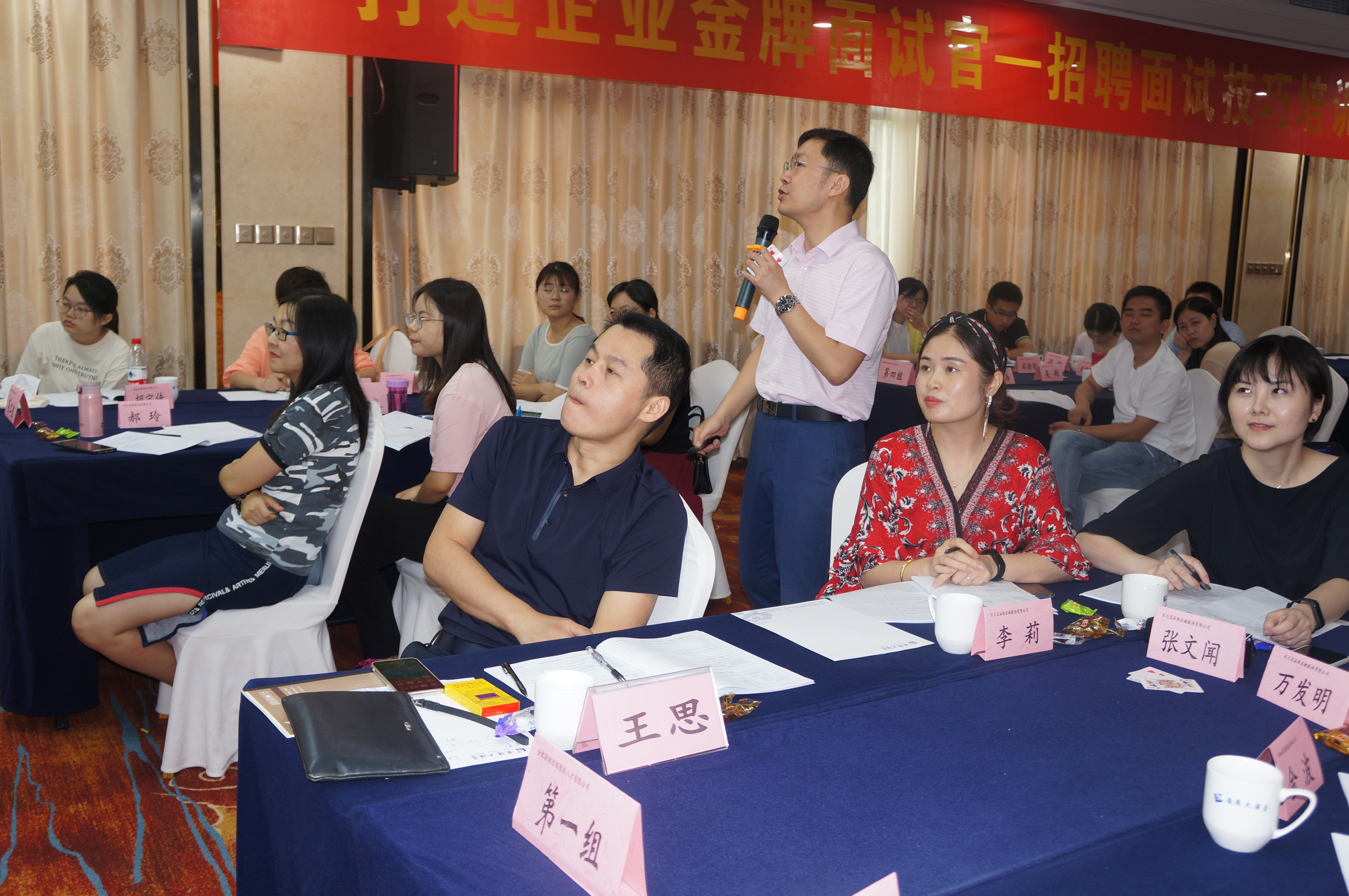 課堂上,單老師主要從面前準備、深層特征、群體面試、人崗匹配、情壓面試、雇主品牌、答疑解惑七個方面進行分析講解。課堂上老師采用生動幽默的講解方式,通過分組討論和案例討論等形式引發(fā)學(xué)員們積極思考,認真聆聽。